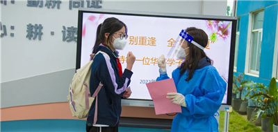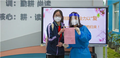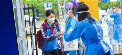 为迎接归心似箭的九年级同学,老师们化身大白和小蓝,早早地等在校门口。伴随轻快阳光的音乐,同学们踏光而来,自觉间隔2米排队,有序扫场所码、测温、领取抗疫礼包,不拥挤、不扎堆,一切井然有序,走进熟悉的校园,按照规定路线走向各班教室,沿途不忘打卡,要将此刻定格。