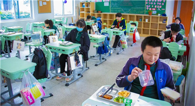 如何确保学生在校安全、有序用餐也是疫情防控的重要环节。午餐时分,同学们在班主任的安排下,分散在同一楼层的三间教室,餐前洗手、排队取餐、安静用餐,不交谈、不喧哗,彰显了九年级学生的文明用餐素养。