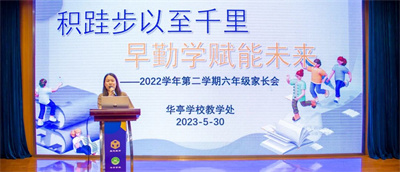 教学处主任秦芳以《积跬步以至千里 早勤学赋能未来》为题,就学生的目标意识和生涯规划与家长们进行分享,针对六七八年级同学的学业现状,前瞻性地联系中考考试科目、升学指导、学校名额分配等情况进行了详细说明,让家长充分了解学生的学业现状、升学方面的重要信息,以便家长们帮助孩子提早做好升学规划。