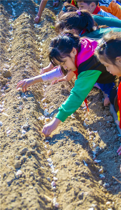 今天的“课植园”异常热闹!当我们来到我们班负责的地块时,发现什么也没有。我正疑惑时,老师提着一袋大蒜向我们走来。老师叮嘱我们,只要把大蒜插进地里,不要把土埋过它。我们按照老师说的那样,一个一个把大蒜有序地插进土里,这些大蒜看起来分外可爱!今天真是开心和满足的一天!